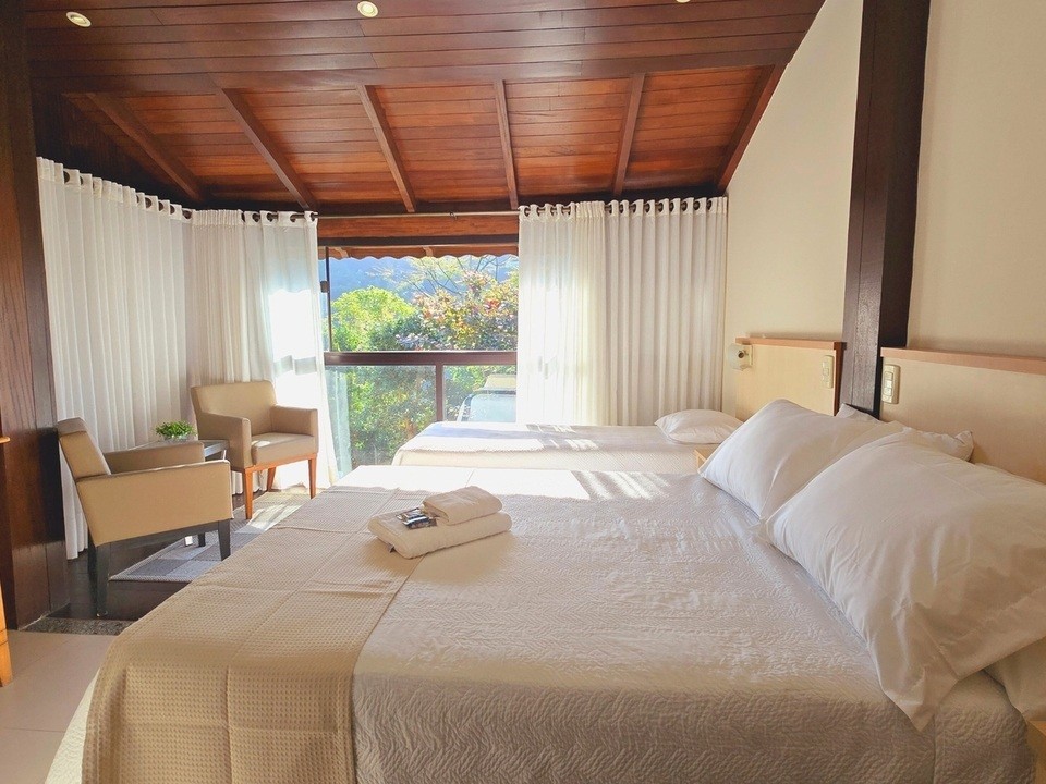 Perfeito para quem busca praticidade e sofisticação, o quarto é equipado com 1 cama de casal e 2 camas de solteiro aconchegantes, TV a cabo, frigobar, ar-condicionado, Wi-Fi grátis e piso laminado para mais comodidade. O banheiro exclusivo oferece chuveiro, secador de cabelo e muito mais. Reserve já e viva uma experiência única!
